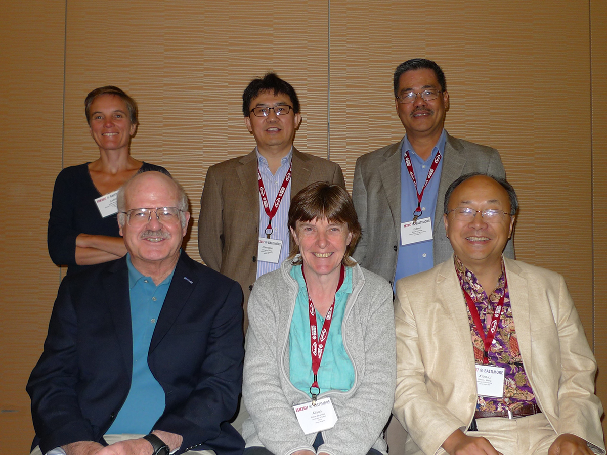 The IMS Executive Committee 2025–2026. Inset left, Executive Secretary Peter Hoff; inset middle, Program Secretary Annie Qu; inset right, Treasurer Jiashun Jin. Main picture, left–right: Past Past President Michael Kosorok (not on 2025-26 Executive Committee), Past President Tony Cai, President Kavita Ramanan.
