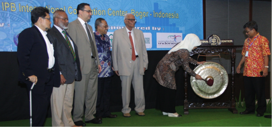 Formal opening of ICCS-13 (from right) Prof Asep Saefuddin, Vice Chancellor of Trilogi University; Prof Illah Sailah, (beating the bell) Director, Ministry of Research, Technology and Higher Education of Indonesia; Prof Munir Ahmed, founding President of ISOSS; Dr Adi Lumaksono, Deputy Chief of National Statistics Office, Indonesia; Prof Savas Alpay, Director General of SESRIC; Prof Shahjahan Khan, acting/former President of ISOSS; Prof Hermanto Siregar, Vice Rector of Bogor Agricultural University.