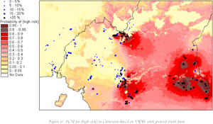 This model has been used in particular to assist the operation of pan-African control programmes for two vector-borne diseases, onchocerciasis (river blindness) and lymphatic filariasis (elephantiasis). The control strategy is based on prophylactic administration of a filaricide, Mectizan, to whole communities in affected areas. In this context, estimating prevalence at a particular location is less important than predicting whether prevalence exceeds a policy-relevant threshold. For example, the operation of the control programmes has been hampered by the recognition that people heavily infected with a third disease, Loa loa (eyeworm), are at risk of experiencing severe, occasionally fatal, adverse reactions to Mectizan. This has resulted in a policy that precautionary measures must be taken before the drug is administered in a community where prevalence of eyeworm is greater than 20%. Accordingly, the map (below) shows the predictive probability, at each location, that this threshold is crossed. The map effectively delineates areas that are “safe”, “unsafe” (predictive probabilities close to zero or one, respectively) and intermediate areas (in pink) where more information is needed.