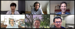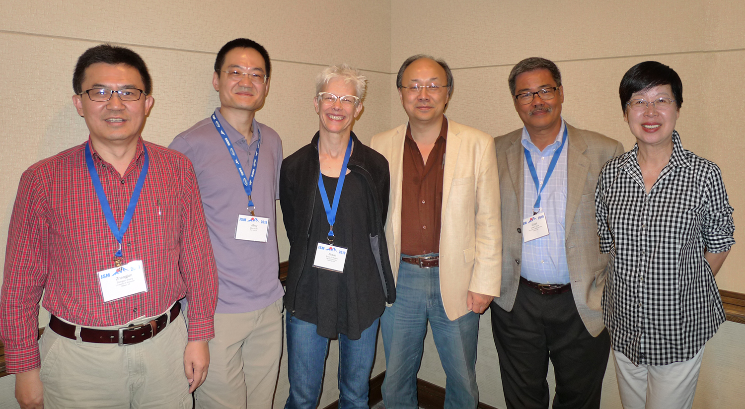 The IMS Executive Committee 2025–2026. Inset left, Executive Secretary Peter Hoff; inset middle, Program Secretary Annie Qu; inset right, Treasurer Jiashun Jin. Main picture, left–right: Past Past President Michael Kosorok (not on 2025-26 Executive Committee), Past President Tony Cai, President Kavita Ramanan.